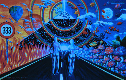 Tripleview Art ™ is a concept created in 1998 by visionary artist Symeon Nostrakis. These are the first blacklight prints in the worldwide market that glow in the dark too! The original art comes from my large scale handmade black-light & glow-in-the-dark backdrops which I started painting in 1998 for psychedelic goa trance parties and psy trance club decor. It is elaborate fine art painted with multiple colour hues and smooth gradient transitions, unlike most other similar prints with plain designs of solid basic colors. My innovative artwork is featured in International Contemporary Masters 2010, an annual luxury publication that presents artists selected according to strict criteria of originality, skill and proficiency. Discover and enjoy the magic of my Tripleview Art!